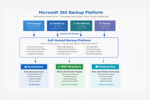Microsoft 365's native retention policies are not designed for disaster recovery. Deleted mailboxes, accidental file deletions, ransomware attacks, and compliance gaps expose organizations to permanent data loss and regulatory violations. Our self-hosted backup platform provides independent protection deployed on dedicated infrastructure in our Tennessee data centeroffering solutions for businesses requiring direct backup services, MSPs building branded backup offerings for their clients, and enterprises needing white-label platform partnerships with complete data sovereignty.