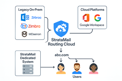 The StrataMail Routing Cloud acts as an intelligent intermediary, handling inbound filtering, outbound relay, and smart routing across both your legacy systems and modern cloud platforms. Whether you're planning a phased migration to Microsoft 365, maintaining hybrid infrastructure for compliance reasons, or simply modernizing parts of your email stack, StrataMail provides the routing intelligence and security layer you need.